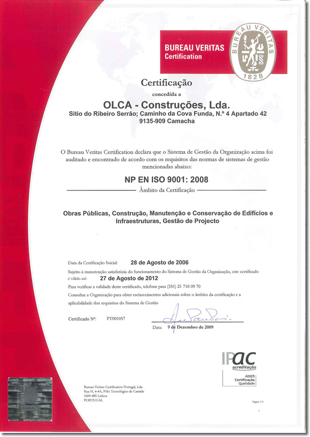 A Olca, estabeleceu, documentou, implementou e mantém certificado desde 2006 um Sistema de Gestão da Qualidade, de acordo com os requisitos da norma de referência ISO 9001:2000, que abrange todas as actividades relacionadas com o âmbito do "Obras Públicas, Construção, Manutenção e Conservação de Edifícios e Infraestruturas, Gestão de Projecto"